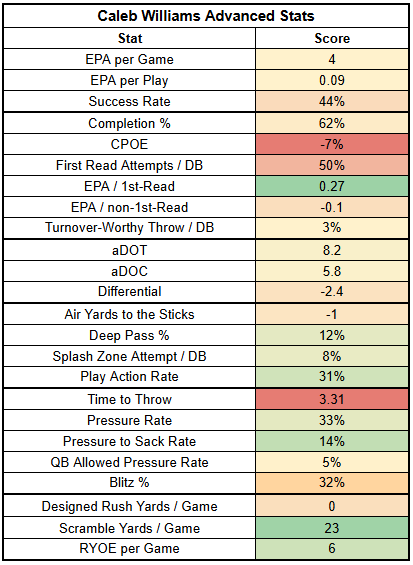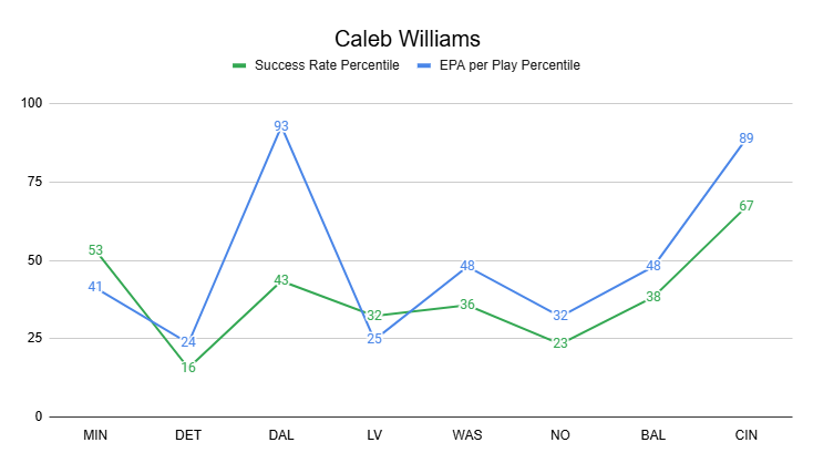 Caleb Williams is coming off his second-most-efficient game of the year, taking advantage of an extremely weak Bengals pass defense. It would have been more fun if Rome Odunze was along for the ride, but Williams paid off in a big way last week.