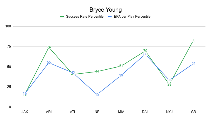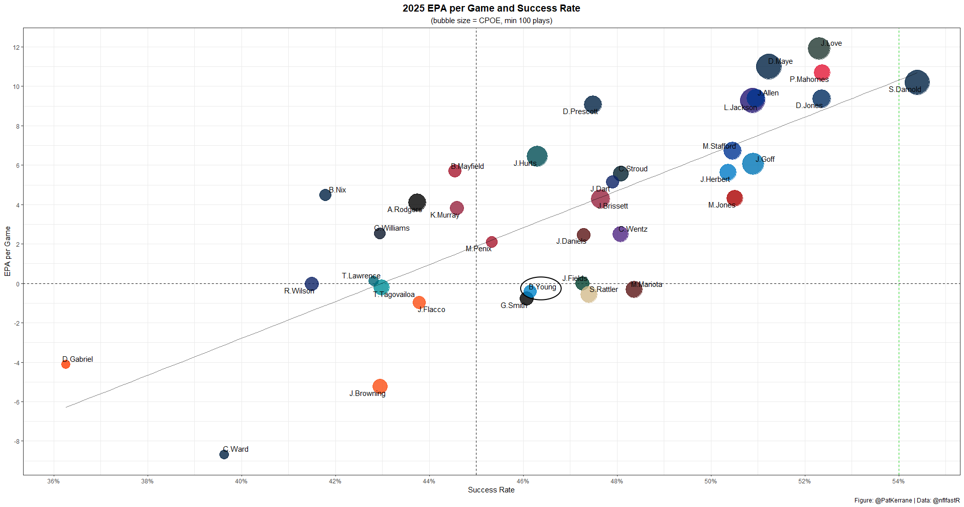 On the season, Young ranks QB30 of 36 in EPA per game. His 46% success rate is stronger, though, ranking QB22. This makes him a minor positive regression candidate.