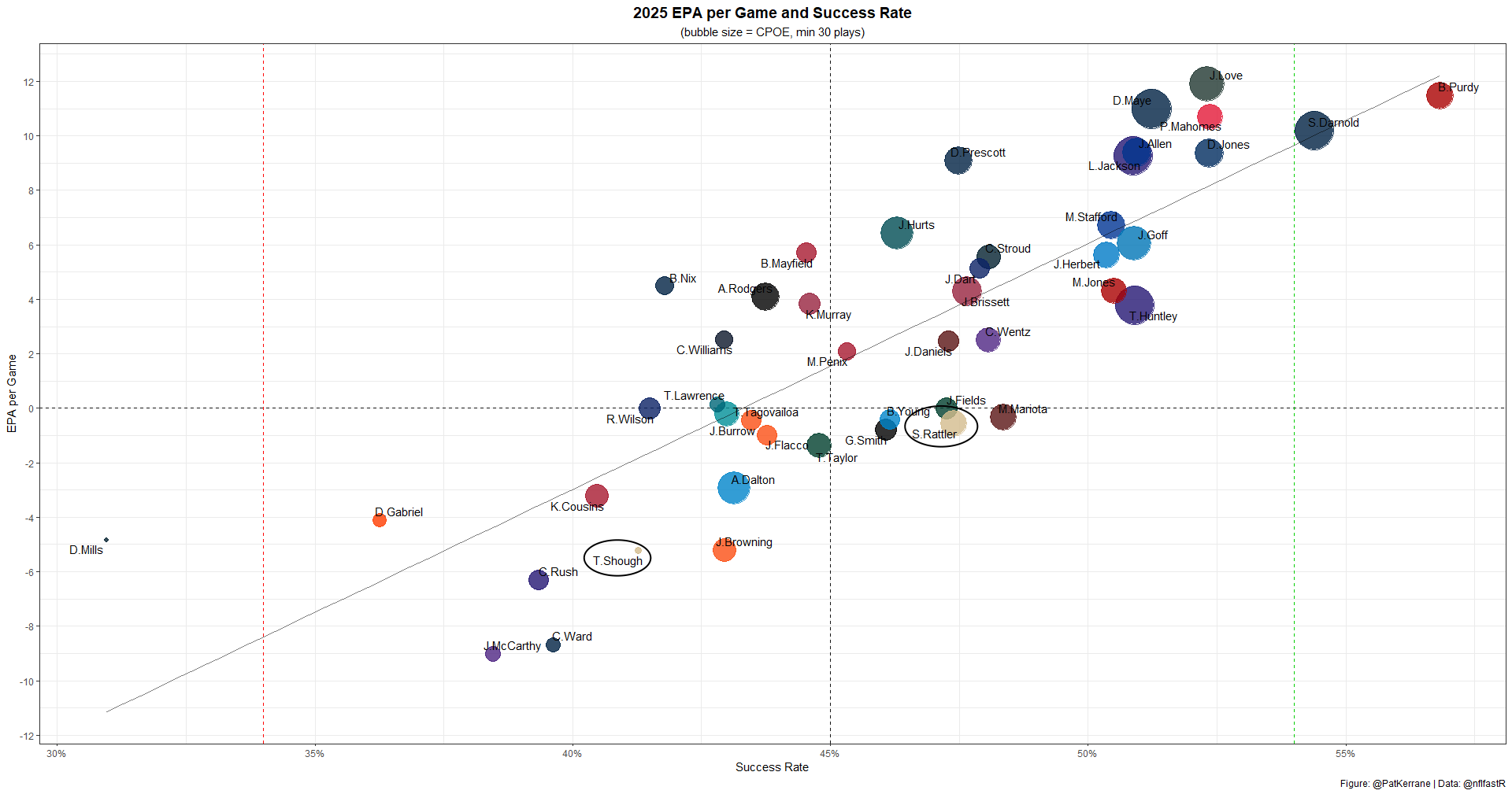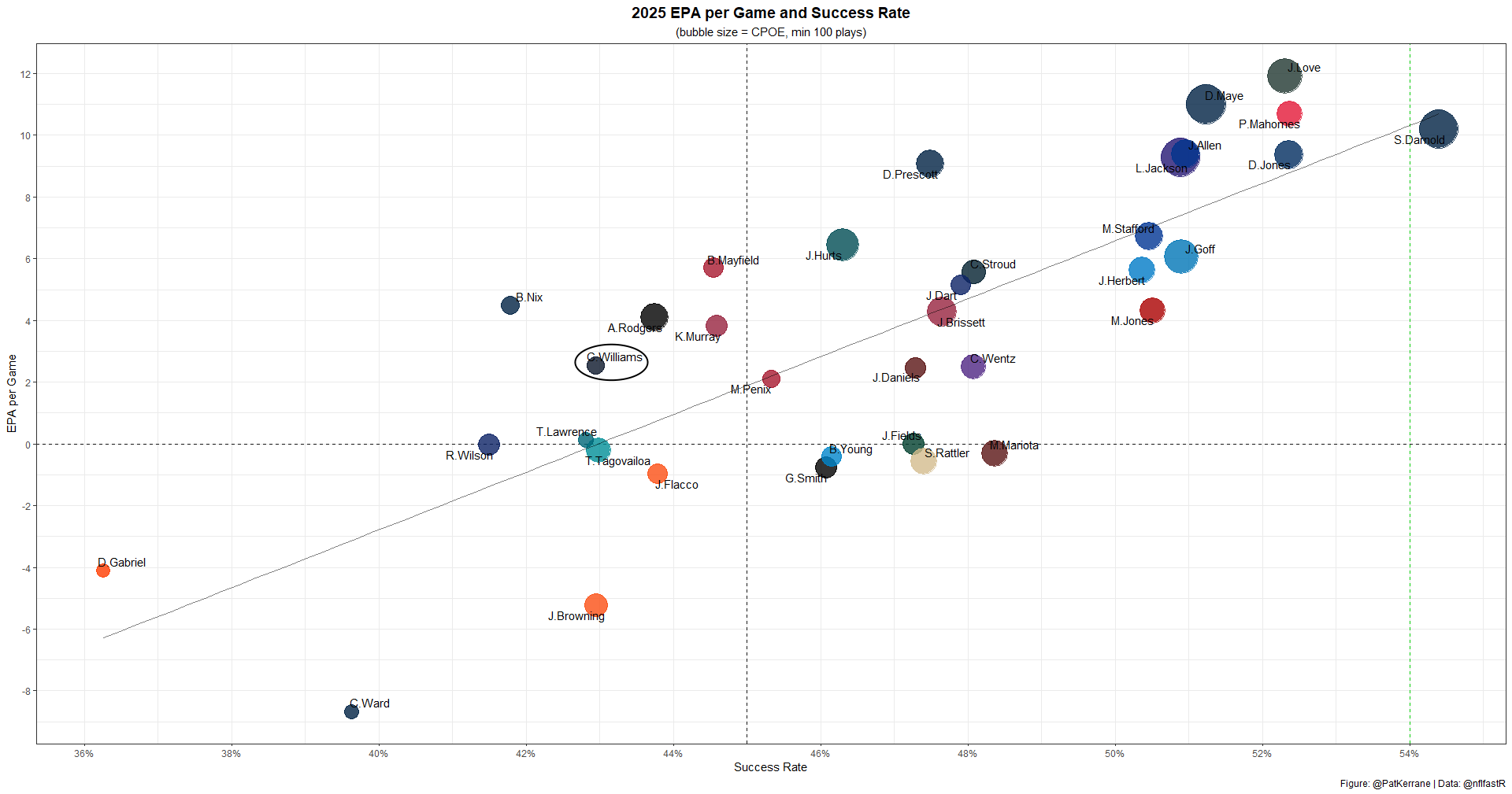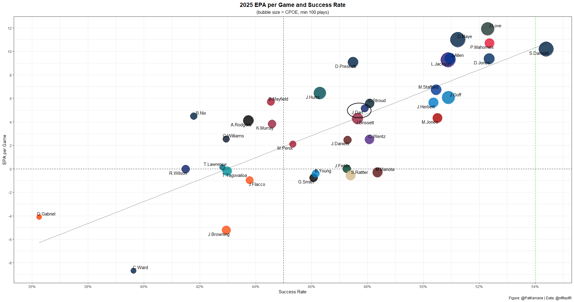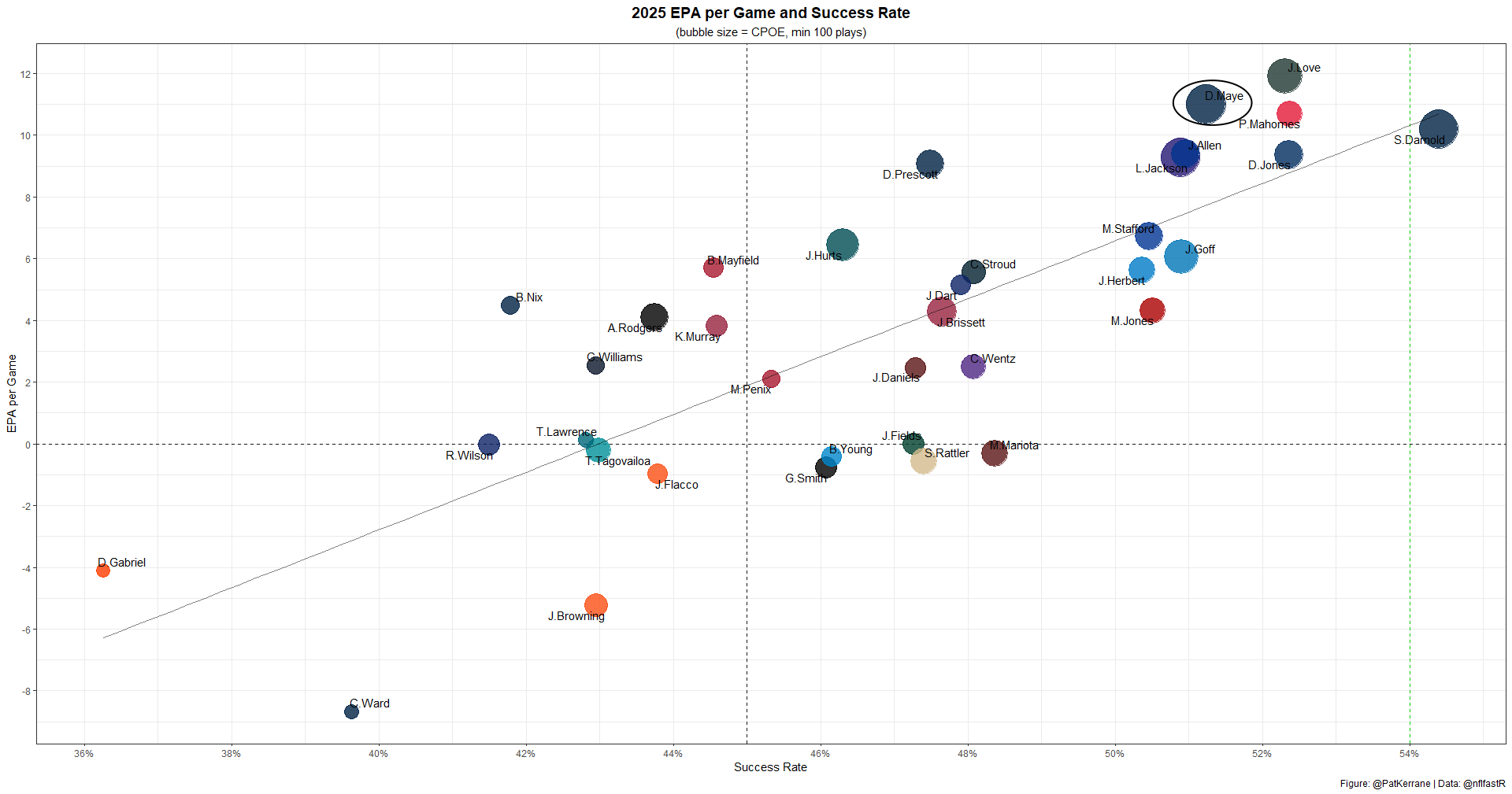For the season, Maye remains QB2 in EPA per game. He's QB5 in success rate. He's still profiling as one of the best bets for passing efficiency in the NFL.