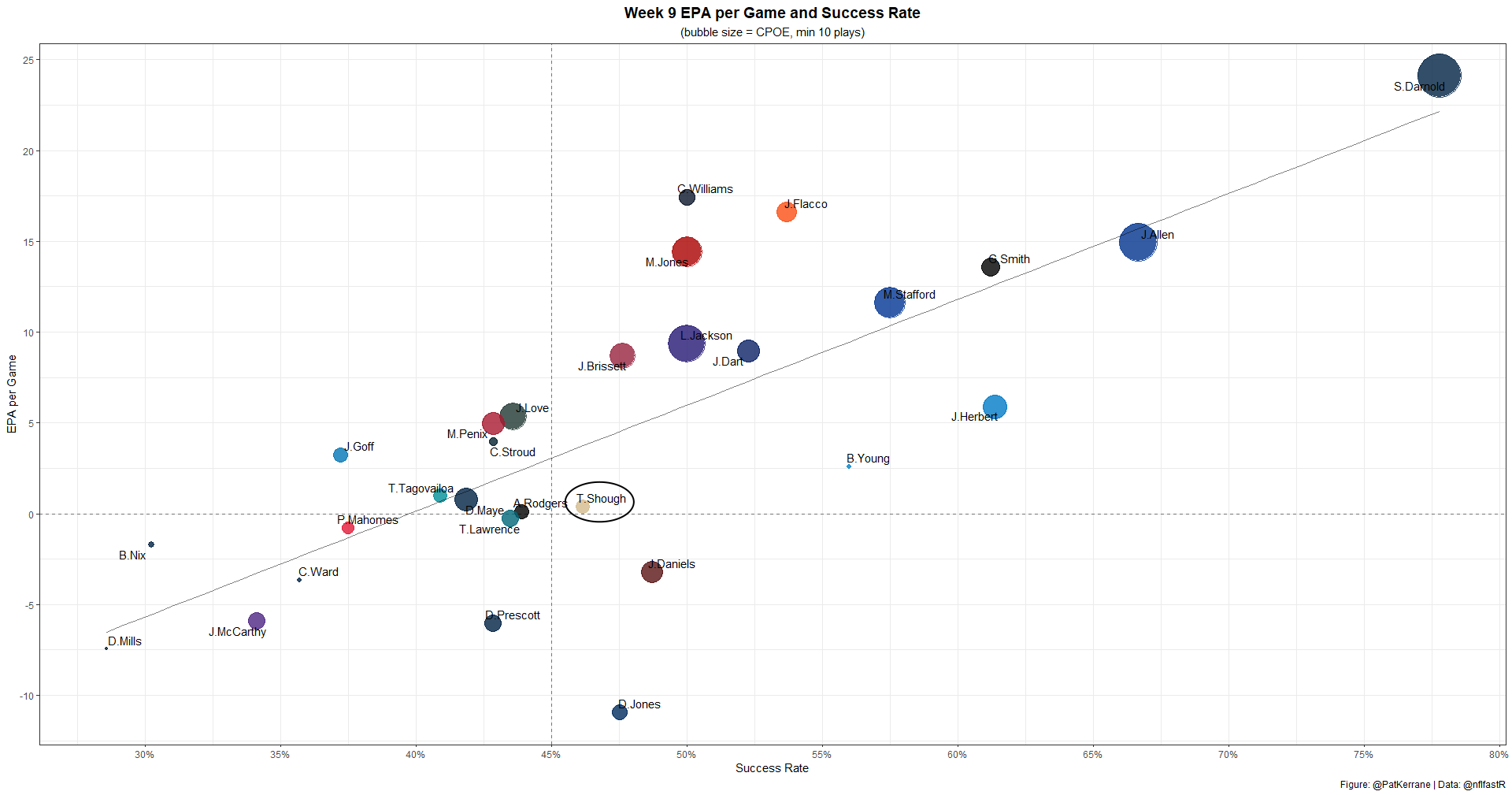 For the season, Shough still ranks just QB43 in EPA per game and QB40 in success rate among 46 q ualifiers. His overall numbers are hurt by his poor play at the end of the Bucs game, reminding us that Shough hasn't exactly been exciting so far. But last week was reasonably encouraging for a rookie QB in a tough first start.