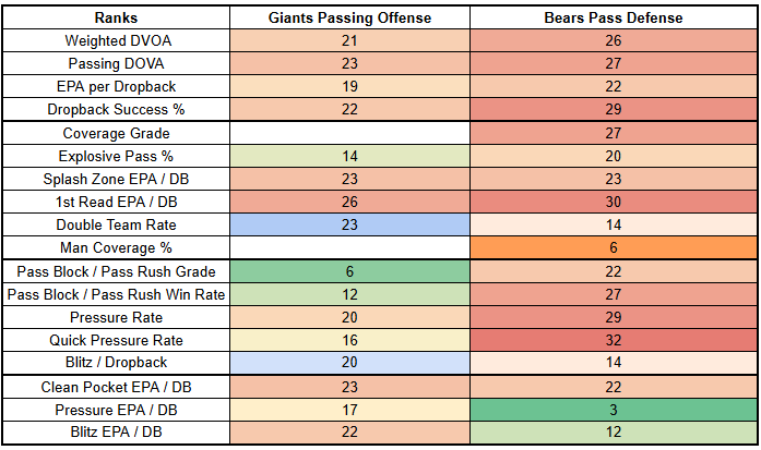 Even without starting C John Michael Schmitz—who hasn't practiced this week with a shin injury—the Giants should be able to hold up against a Bears pass rush that ranks dead last in quick pressure rate.