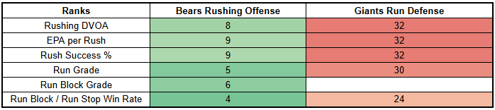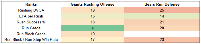 As I'll cover on the other side of this game, the Bears are very likely to lean on the run here. As a result, the Giants may have the option to lean on the run even if this ends up being a back-and-forth game. At the very least, they have a good chance of staying balanced.