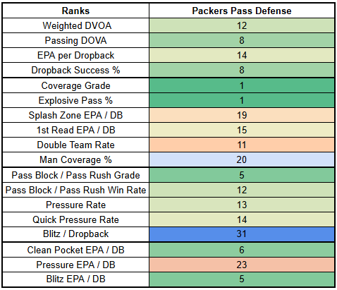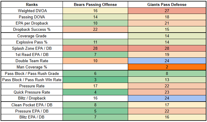 The Giants' pass rush isn't especially impressive by the numbers. But the Giants can pressure without blitzing, and they have star power. At EDGE, Abdul Carter ranks 15th in pass rush win rate, and Brian Burns ranks 18th. At DT, Dexter Lawrence ranks third in pass rush grade. This is a pass rush that could give Caleb Williams trouble... especially since he's likely to give them plenty of time to get home.