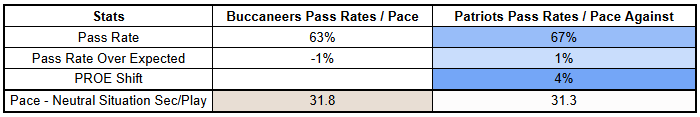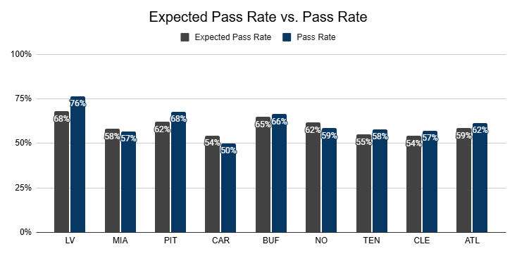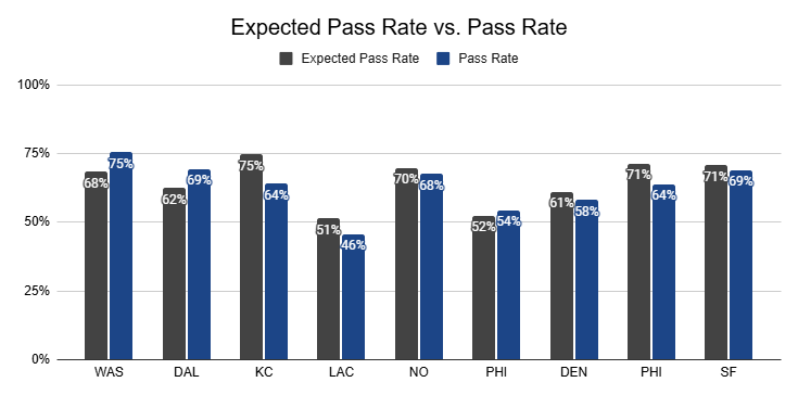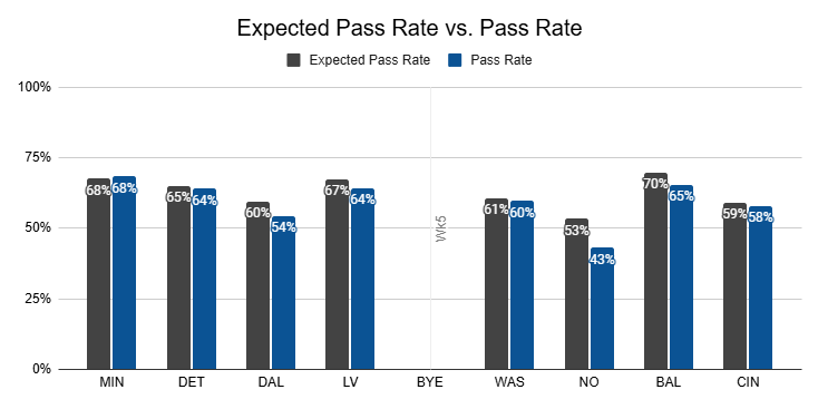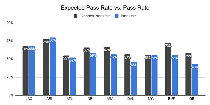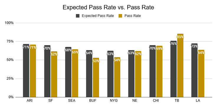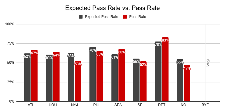 The Bucs have been kind of all over the place from a pass rate perspective. In games against the Jets, Eagles, 49ers, and Vikings, they pounded the rock. But they've also been pass-heavy against the Texans, Seahawks, and Lions.