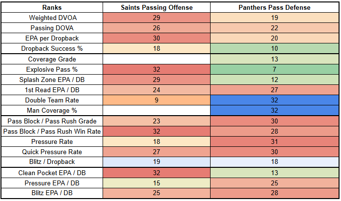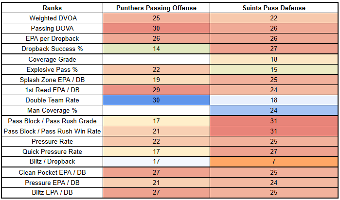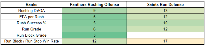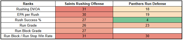 On the ground, the Panthers looked like an impressive run defense for a week or two, but have settled into mediocre territory. Still, they aren't nearly as bad as they were in 2024. Meanwhile, the Saints are one of the worst rushing teams in football.