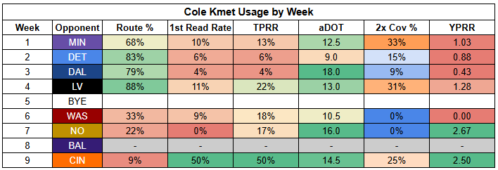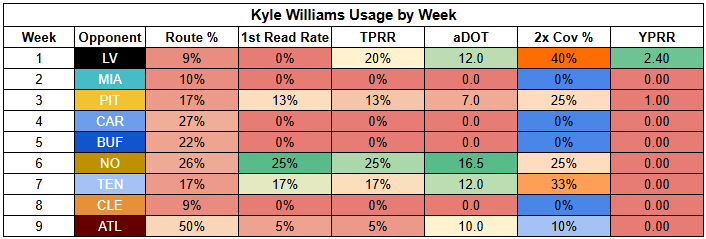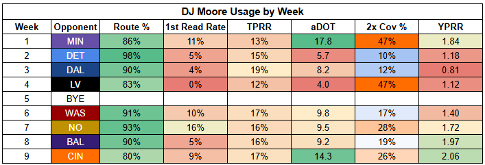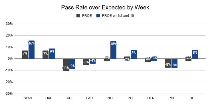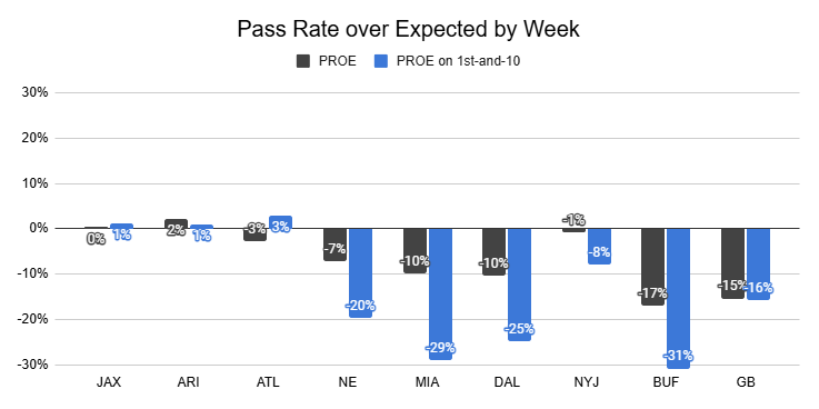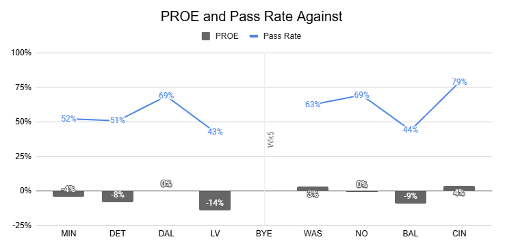 Even with Williams turning in an excellent performance against the Bengals, the Bears posted just a 58% pass rate and a -1% PROE. The Bears haven't had a positive PROE since Week 1.