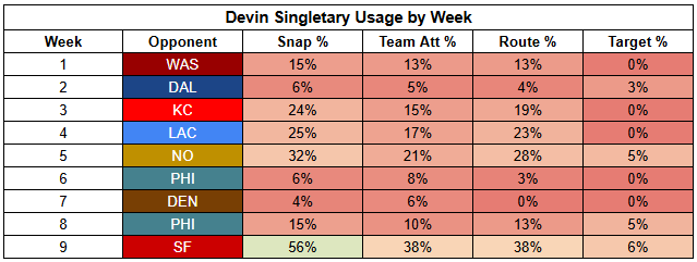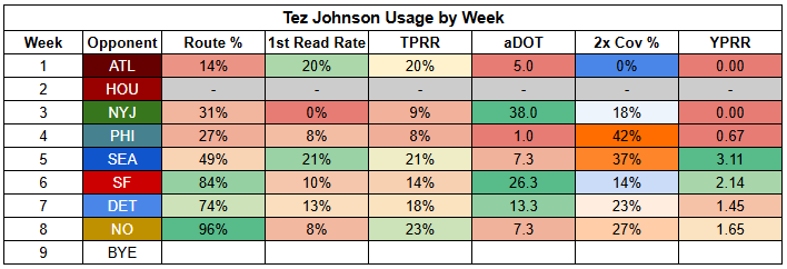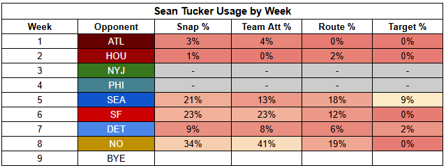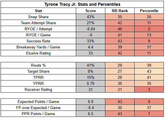 Singletary ran well last week, turning in 43 yards and 10 RYOE on eight carries. Tracy managed just 18 yards and -3 RYOE on five carries. So, there's no reason to expect a big shift in usage this week. And frankly, I should have been more open to this kind of split in the first place, given how poorly Tracy has played this year.