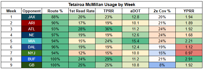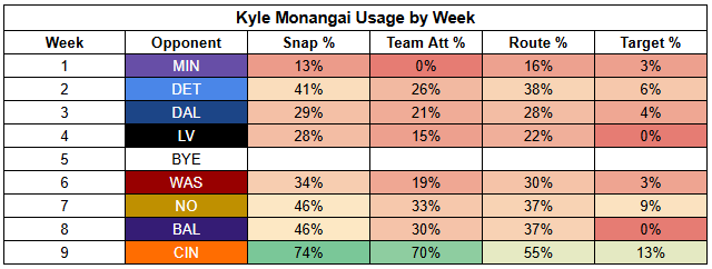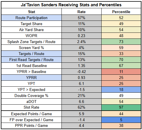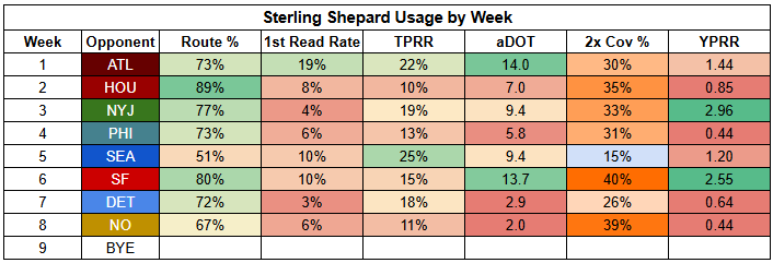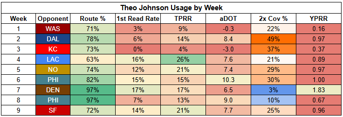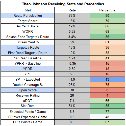 At tight end, Theo Johnson saw his route participation drop a bit with Daniel Bellinger out, and still struggled to produce anything on reasonably strong opportunity.