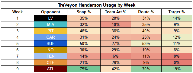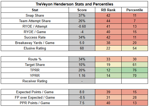 With Rhamondre Stevenson out of the lineup last week, TreVeyon Henderson dominated backfield snaps, routes, and targets. But his carry share left something to be desired.