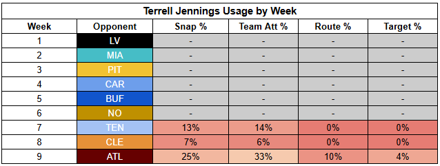 With a 43% success rate against the Falcons, Henderson was actually significantly more consistent than Jennings (36%). But Henderson posted -6 RYOE with Jennings at -3; neither RB showed much burst.