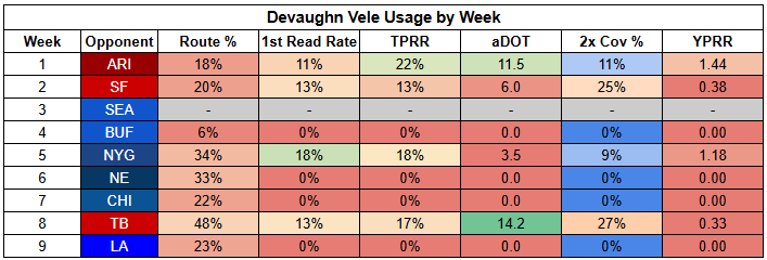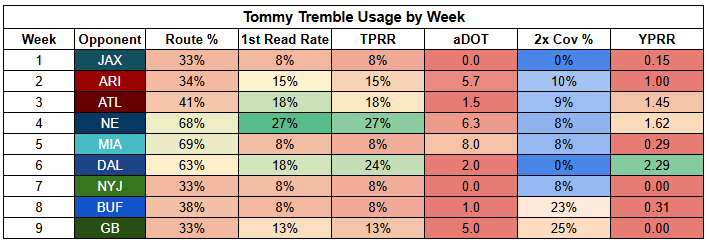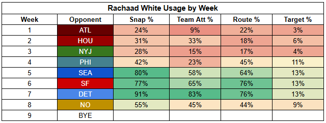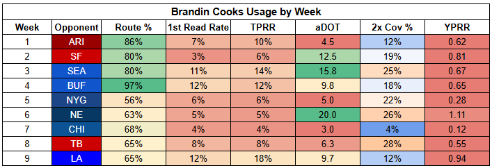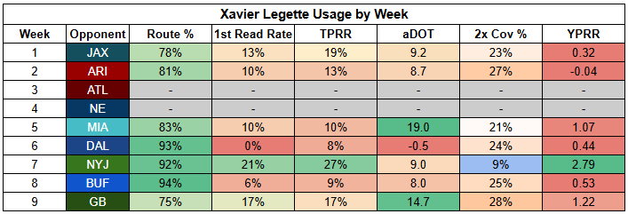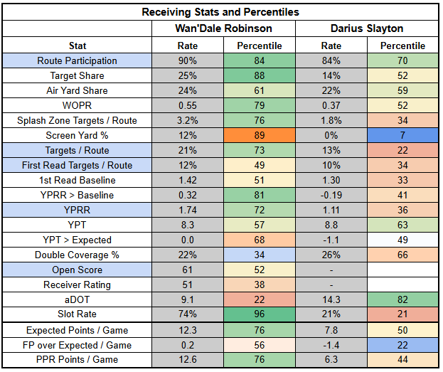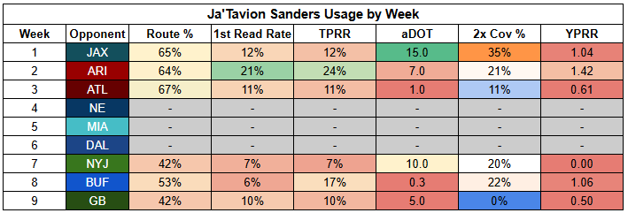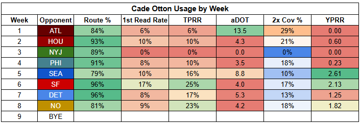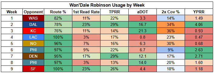 Robinson's first-read target rate isn't ideal, highlighting some variance in his profile. But Robinson tied his highest first-read target rate of the season against the 49ers, and was back in a shallower aDOT role, while still running a route on every dropback.