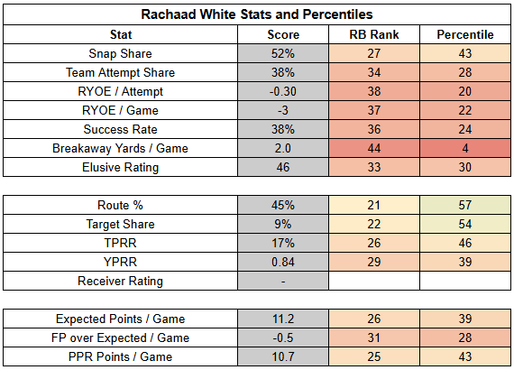 Against the Patriots, the Bucs are unlikely to be leaning on a downhill rushing attack the way they did against the Saints, tilting things back in White's favor to some degree. Still, White's profile is very much volume-dependent, and that volume isn't as locked in as it looked before Week 8. White is a low-end RB2.