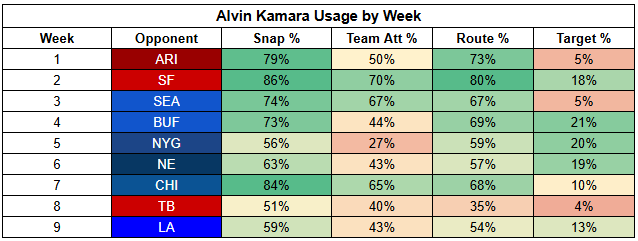 That sets up Alvin Kamara for a solid workload. But he will be in a split with Devin Neal, who has seen healthy snap shares over the last two weeks and is posting significant route participation.