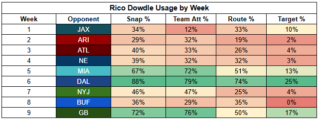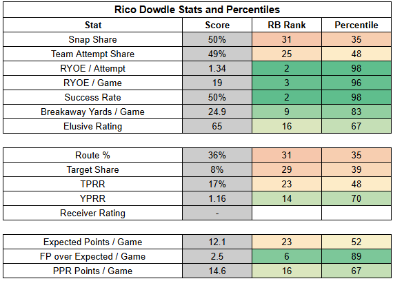 Against the Packers, Rico Dowdle didn't just lead the way; he returned to a similar role to what he had when Chuba Hubbard was out. This was workhorse usage.