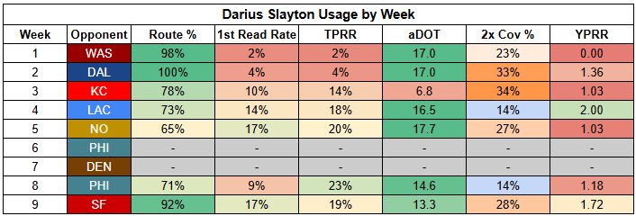 Daris Slayton is coming off his highest route participation since Week 2, which makes his boom/bust profile a little more tolerable. He's a WR5.