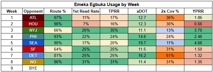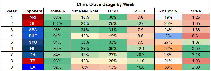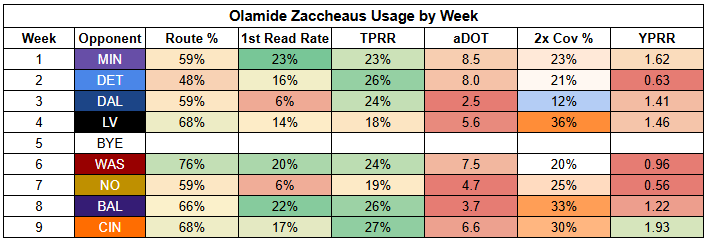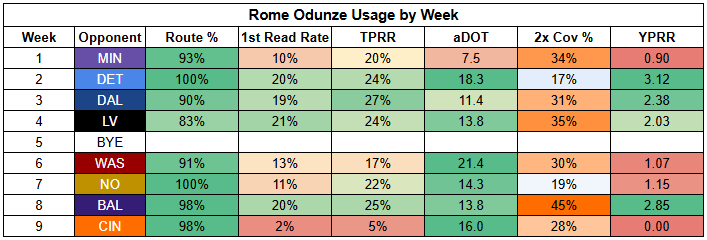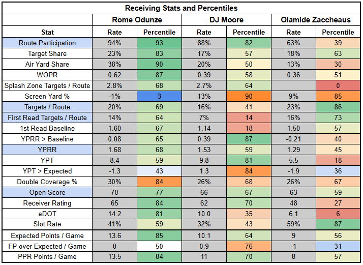 For the season, Odunze still has the strongest profile on the team, but he's not profiling as the obvious No. 1 that he was earlier in this year. Interestingly, Zaccheaus is earning targets at the highest rate per route, and that's supported by the highest first-read target rate of the three.