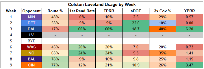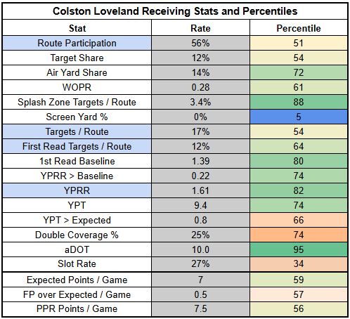 With a 10 aDOT, Loveland has been a downfield threat for the Bears, which makes him a bit more interesting in this matchup—it's not like he needs to rack up target volume to make an impact. Even with his route participation being a minor question mark, Loveland is a high-end TE2.
