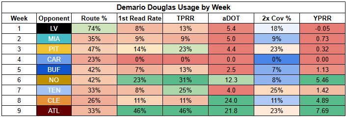 Even with limited route participation from Boutte, we still saw Mack Hollins and Demario Douglas in part-time and rotational roles, respectively. Douglas—and this kind of seems like his thing now—was insanely efficient on limited volume. But he's just not playing enough to be a managed league option. The best ball bags appreciate the spike weeks, though.