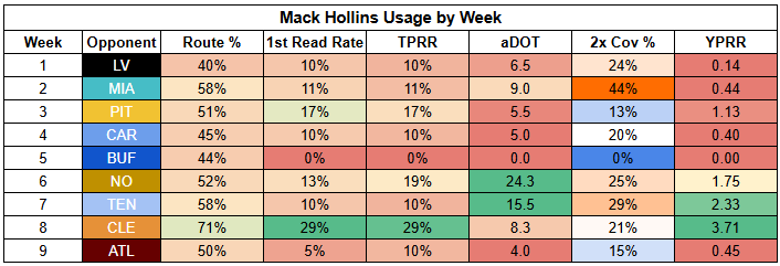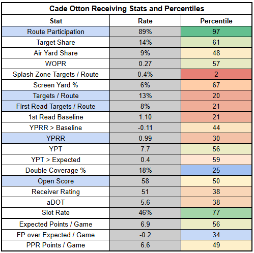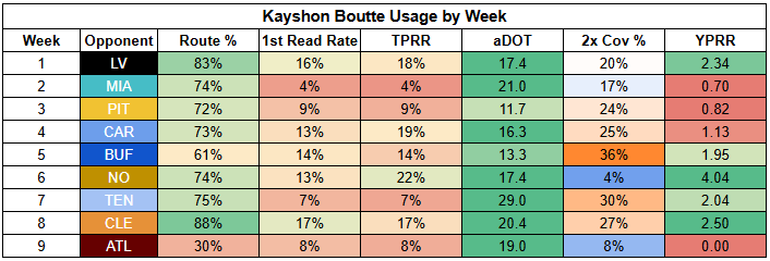Diggs is also getting open at an elite rate, reinforcing his very strong 19% first-read target rate. This is a WR that the Patriots want involved and who looks capable of consistently getting open when Maye is looking for him. Despite a couple of quiet games, Diggs is a low-end WR2 here.