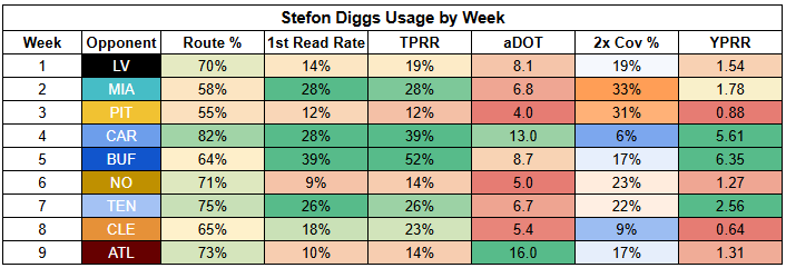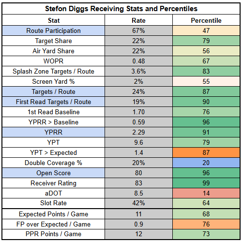 Stefon Diggs has had a quiet couple of weeks, but is running routes at a solid rate and should be a big part of the game plan with Boutte not at 100%, or out.