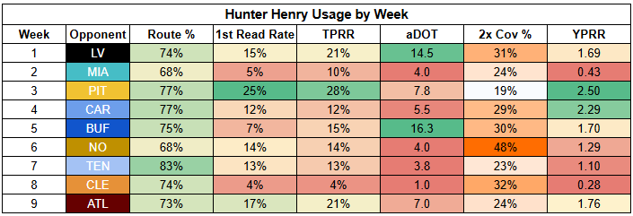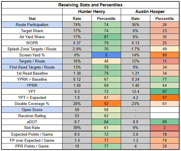 At tight end, Hunter Henry turned in a 4/51/0 receiving line on six targets against the Falcons, posting his most efficient game since going 2/39/1 against the Panthers.