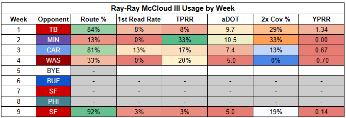 Ray-Ray McCloud made his Giants debut last week, surprisingly posting 92% route participation against the 49ers. He hasn't shown an ability to actually earn targets, though.