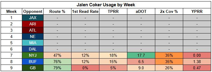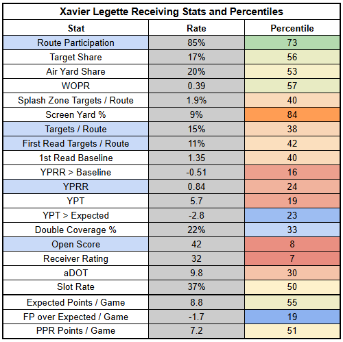 Legette earns targets deeper downfield than Coker, which is something, at least. But his underlying stats are relatively weak this year. He's just a dart throw.
