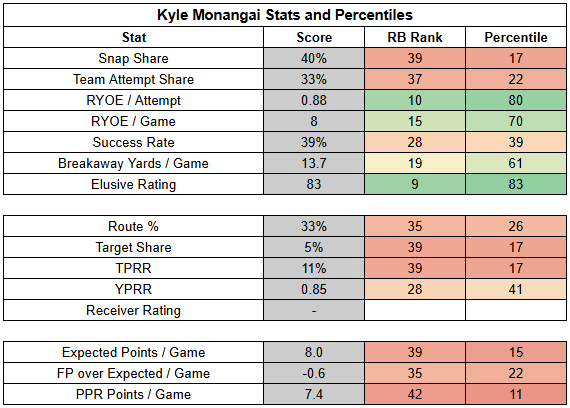 I refuse to apologize to Caleb Williams... but I do owe one to Kyle Monangai. I was skeptical that he could efficiently deliver on last week's opportunity. But he did just that, posting a week-leading 179 rushing yards with 59 RYOE. He's now profiling as a perfectly cromulent runner.