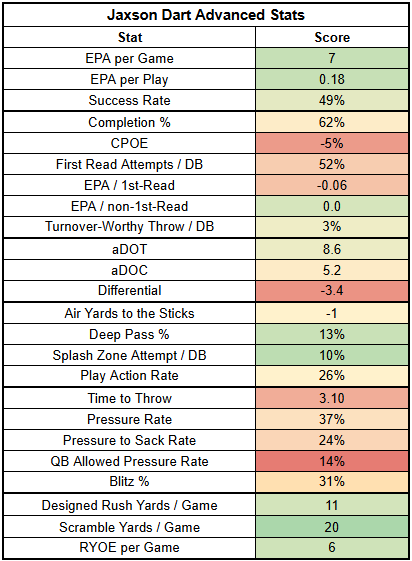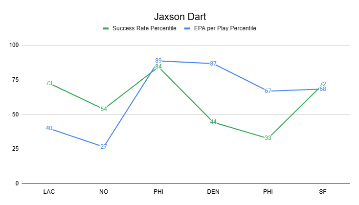 Among QBs with 100+ dropbacks, Dart now ranks QB15 in EPA per game and QB15 in success rate. He's profiling as a very solid starter, someone whose development looks like it's on the right track.