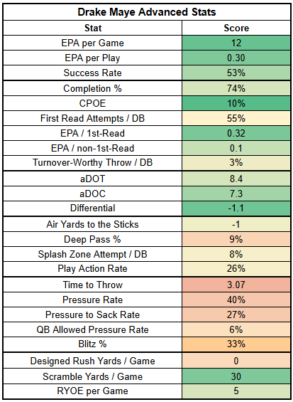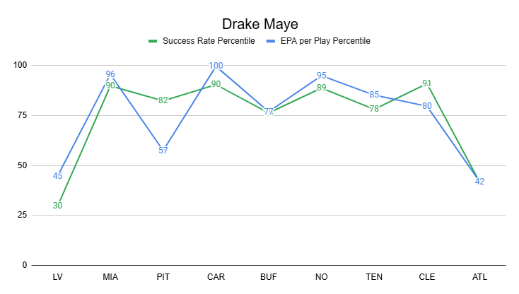 For one thing, even with Maye turning in his worst efficiency of the season, they posted a league-average 62% pass rate, 3% above expected.