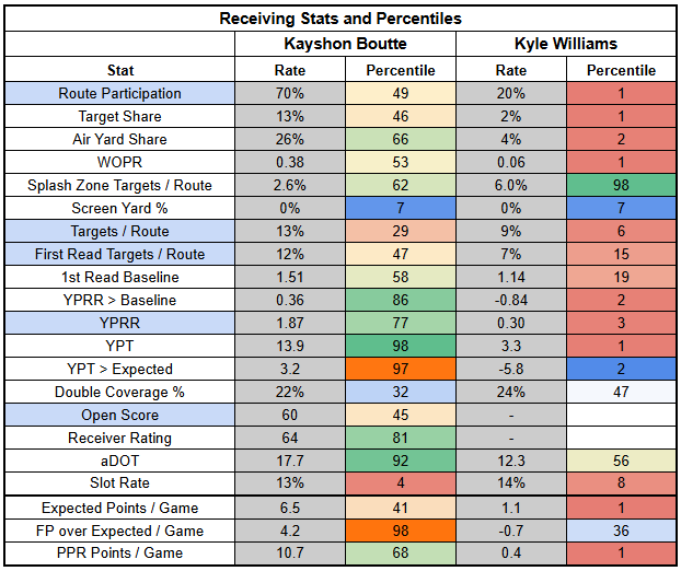 The other silver lining is that Maye had a 12.3 aDOT against the blitz last week. The Patriots weren't able to connect deep like usual. In addition to the matchup, Maye was hurt by Kayshon Boutte leaving with an injury. But the lack of deep production wasn't driven by Maye getting conservative.