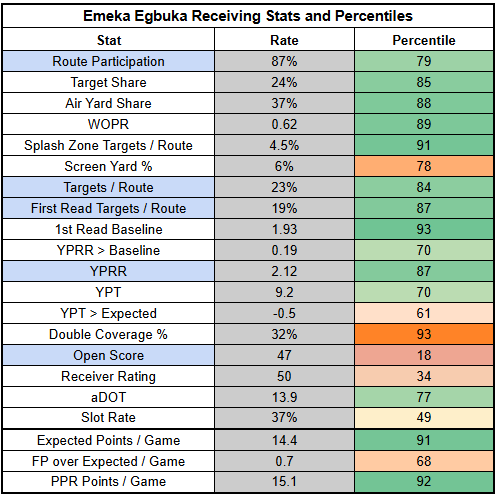 Earlier in the year, Egbuka was profiling as a major negative regression candidate. And over his last three games, that regression arrived in a big way. But now... Egbuka profiles as a straight-up No. 1 WR who is consistently earning targets despite dealing with a ton of double coverage. This is a profile I think we can take roughly at face value now. And in a matchup that creates upside for passing volume and scoring from both offenses, Egbuka is a WR1.