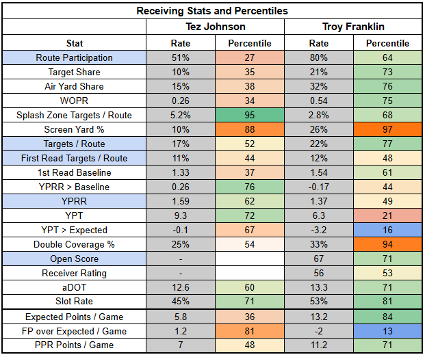 On a per-route basis, Johnson hasn't been great, but he hasn't been bad either. Johnson is sort of shaping up as even-skinnier Troy Franklin. Like Franklin, Johnson is playing about half of his snaps in the slot. Like Franklin, he gets used in the screen game. And like Franklin, he's earning targets despite not being a huge factor on the playsheet. He's also more of a deep threat than you'd assume at a playing weight of 142 pounds, apparently.