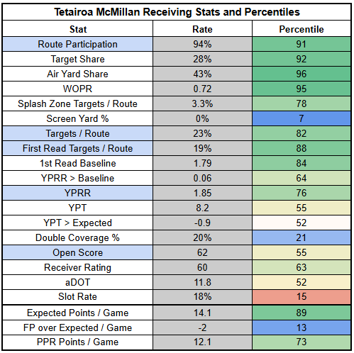 McMillan's underlying numbers are very strong. He's dominating targets, is clearly installed as the No. 1 WR, and is producing efficiently. Unfortunately, this isn't a matchup where we can expect the Panthers to drop back more than usual—if anything, volume may drop. The silver lining is that Young could be very efficient, working off of a run-heavy attack against a vulnerable pass defense. McMillan is a low-end WR2.