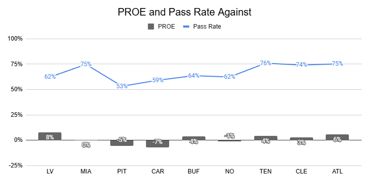 That makes it all the more notable that only two teams—the Steelers and Panthers—have posted below-average pass rates against the Patriots, while all three of their most recent opponents have posted pass rates of 74%+.