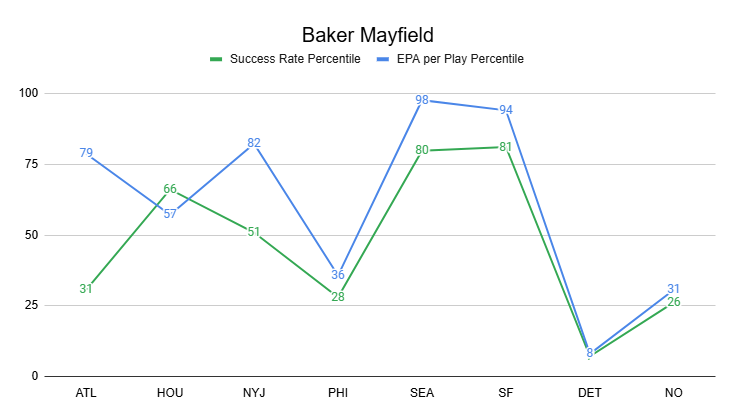 This isn't a shutdown defense by any means, but it's not a pushover either. And, against New Orleans, Mayfield showed a concerning floor with very poor efficiency and consistency.