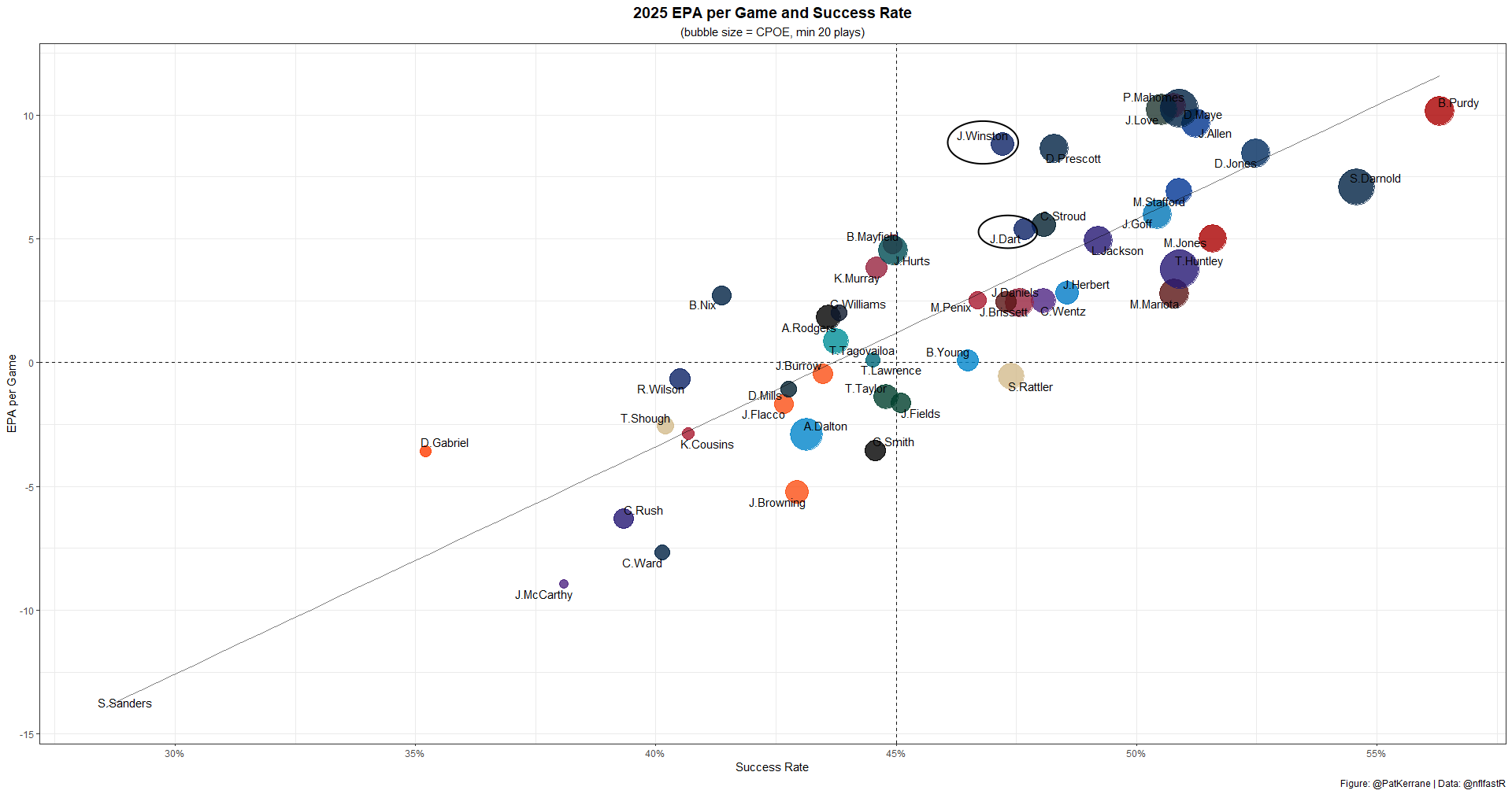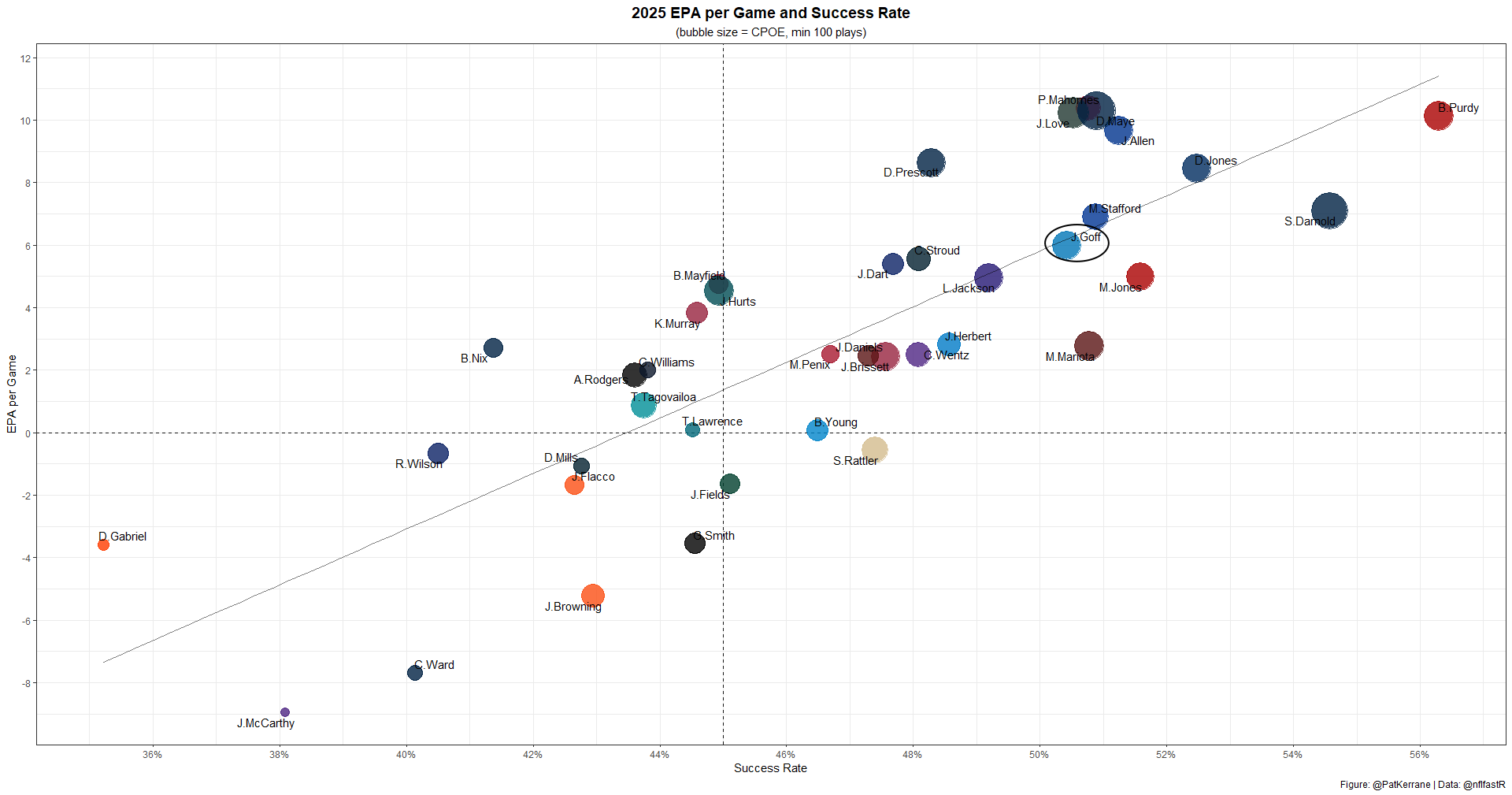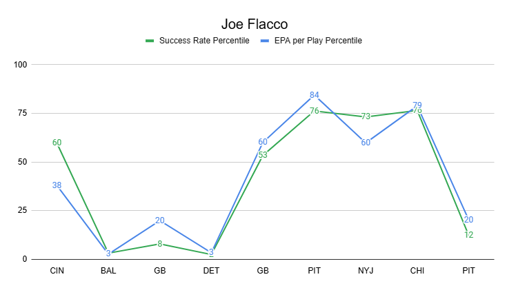 For the year, only Geno Smith, Dillon Gabriel, Jake Browning, Cam Ward, and JJ McCarthy have been worse in EPA per game. Only Bo Nix, Russell Wilson, Cam Ward, JJ McCarthy, and Dillon Gabriel have a worse success rate than Joe Flacco.
