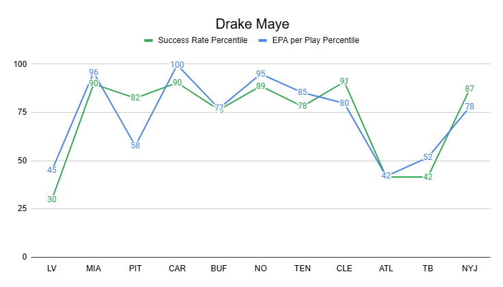Drake Maye is coming off a 78th percentile mark in EPA per play against the Jets. He's now been 75th percentile or better in seven games, which is tied with Josh Allen for the league lead.