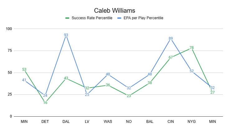 Meanwhile, Caleb Williams has repeatedly turned in weak efficiency, including last week against the Vikings. If he's not playing the Cowboys or Bengals... Williams just isn't likely to turn in an efficient four quarters.