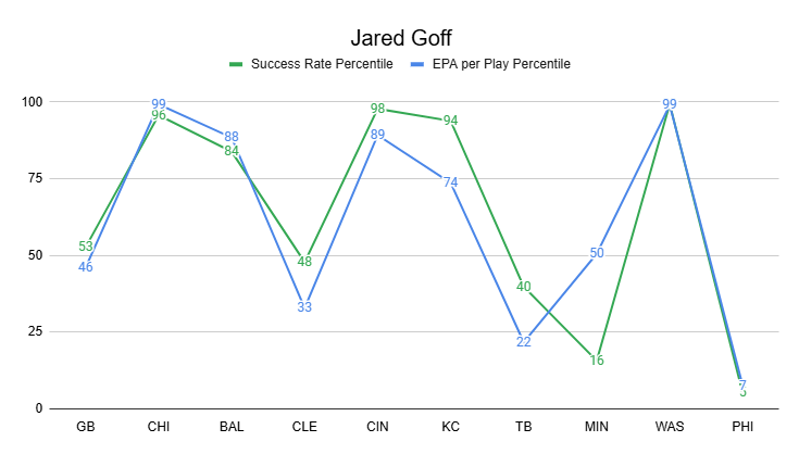Even after cratering last week, Jared Goff looks pretty strong in the season-long numbers. He ranks QB10 in EPA per game and QB11 in success rate. Back at home and in a great matchup, he should be able to get back on track.