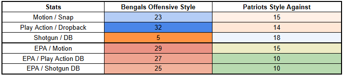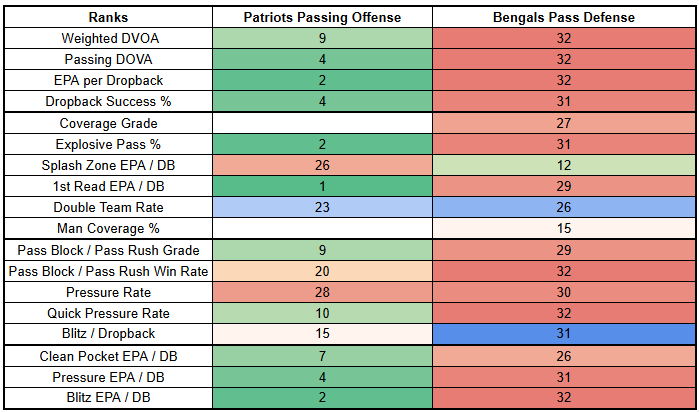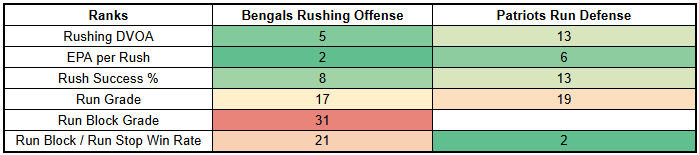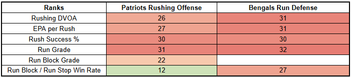 The Bengals are also very weak against the run, creating an opportunity for the Patriots to pivot to the ground game.