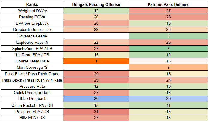 However, pressure is not something we need to worry about this week. The Patriots are taking on the Bengals, who have arguably the worst pass rush in the NFL.