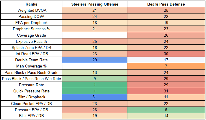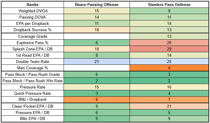 This matchup offers potential for big plays... for either the offense or the defense. The Steelers are allowing explosive passes at a high rate, but they also have a dangerous pass rush that is getting to the QB quickly.