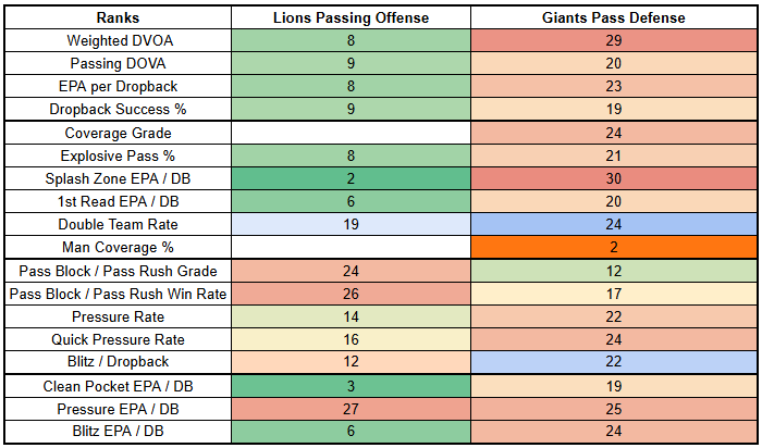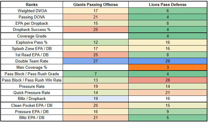 But the Giants have another tough matchup against the Lions this week. The Lions are dealing with some injuries in the secondary with CB Terrion Arnold set to miss with a concussion and S Kerby Joseph likely out with a knee injury. But they've weathered injuries well in previous games and remain a relatively difficult matchup.