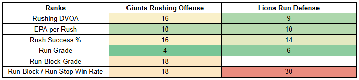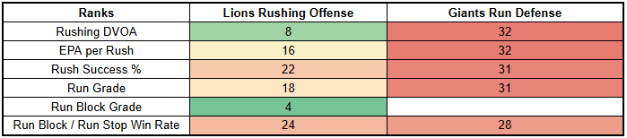 However, this is not a tough matchup. For a team like the Lions, it's a borderline dream matchup. The Giants have the worst run defense in the NFL.