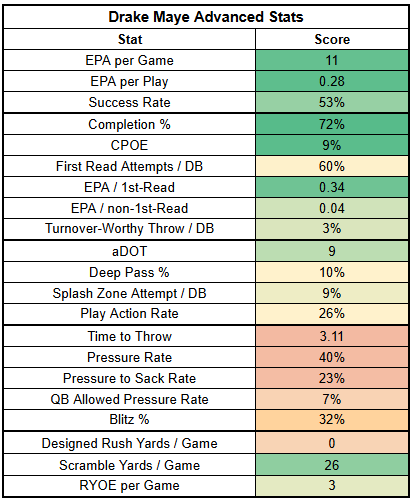 Maye is also playing behind an offensive line that isn't terrible but can get exposed when facing a strong pass rush.