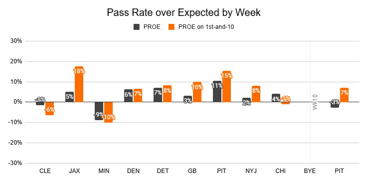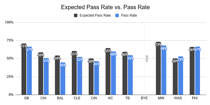 Last week, for the first time since Flacco joined the team, they posted a negative PROE (-3%). But that was with Flacco playing very poorly, and they remained aggressive on 1st-and-10. This is a team built around the pass. And what's the point of bringing Burrow back if you're not planning to feature him?