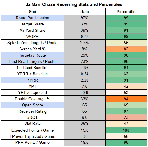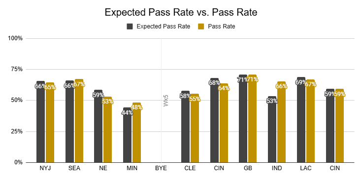 The Bengals also posted a very healthy 66% pass rate last week. Even if they are less aggressive than usual without Chase, this is not a team that we should expect to fight against negative game script.