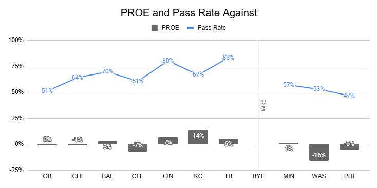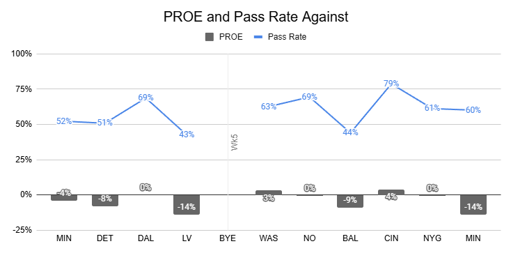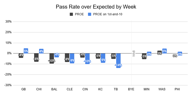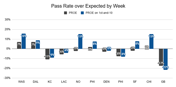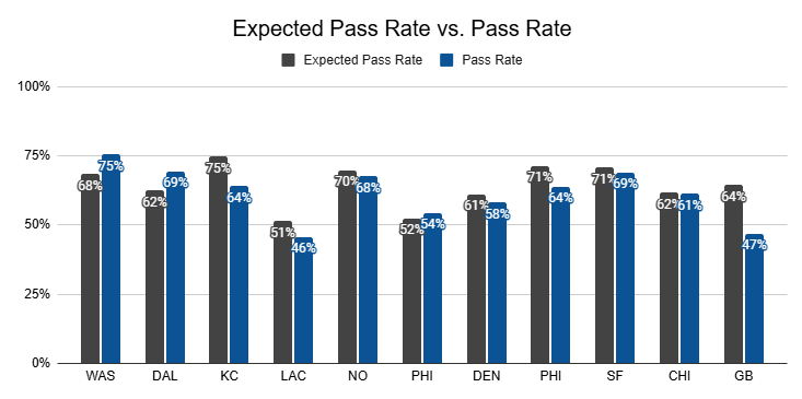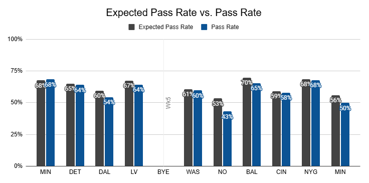 Dart's first start against the Chargers was the only game this year in which the Giants passed less frequently, and that was in a win with positive game script. Last week, Kafka refused to pass despite a game script that called for it.