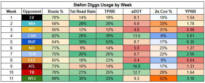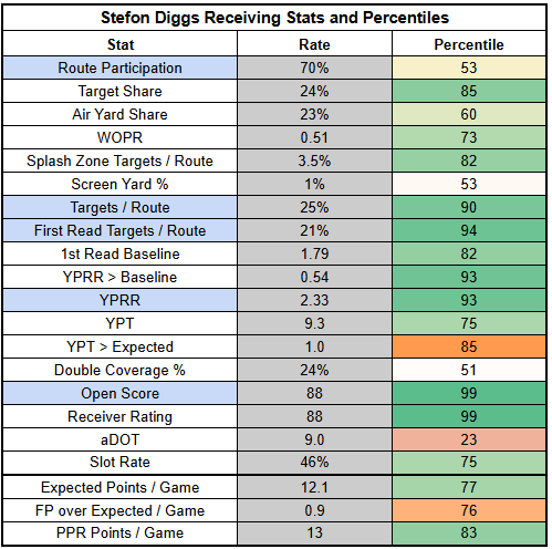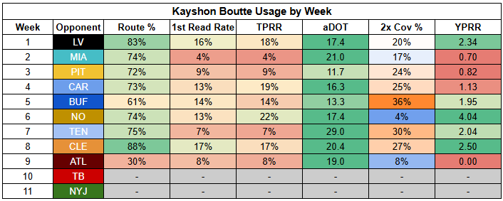 We look to be at a point where Stefon Diggs is a reliable starting option alongside Maye. Diggs is coming off a season-high 89% route participation and consistently drew targets against the Jets, despite a very high double coverage rate.